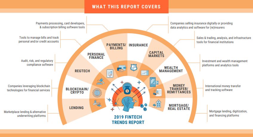 根据创投数据库 CB Insights 对金融科技的划分,金融科技被划分为借贷(Lending)、区块链与加密货币(Blockchain/Crypto)、合规技术(Regtech)、个体金融(Personal Finance)、支付(Payments/Billing)保险(Insurance)、资本市场(Capital Markets)、资产管理(Wealth Management)、转账与汇款(Money Transfer/Remittances)、按揭与地产(Mortgage/Real Estate)等十大领域。