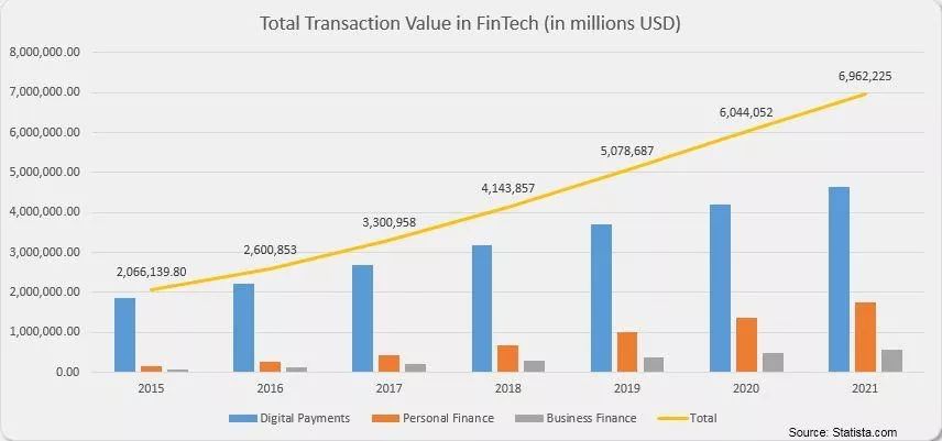 据 Statista 发布的报告显示,金融科技市场将保持 20% 的增长率,到 2021年,将达到 7 万亿美元市场规模,其中,数字支付是最大的部分,价值2.7万亿美元。