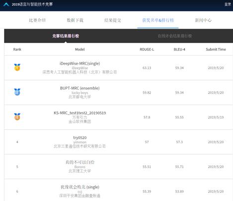 而最近由中国计算机学会(中国计算机领域最权威学会)、中国中文信息学会(人工智能自然语义理解最权威学会)和百度公司联合举办的“2019机器阅读理解竞赛”中,经过全球2502个团队长达2个月的激烈角逐,深思考人工智能在两项评测指标中均登顶全球榜首,成功夺取全球冠军。