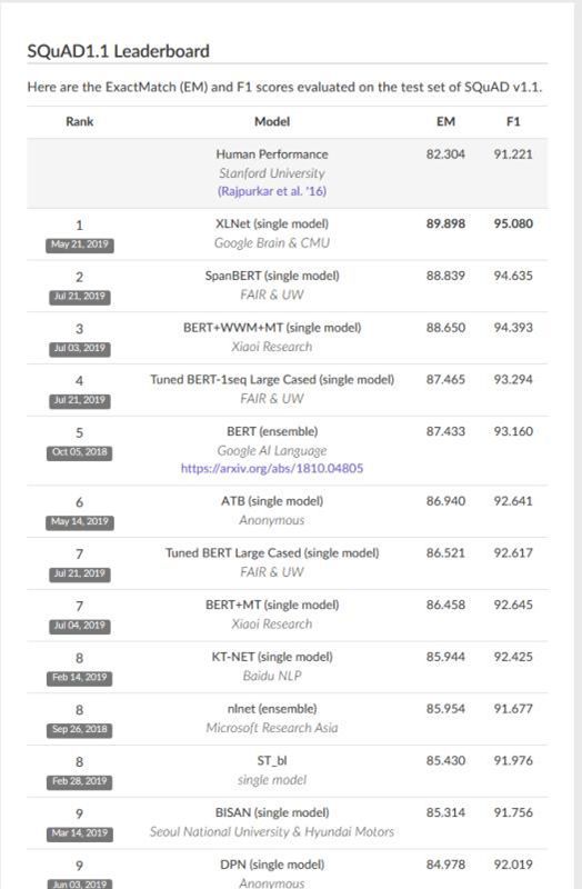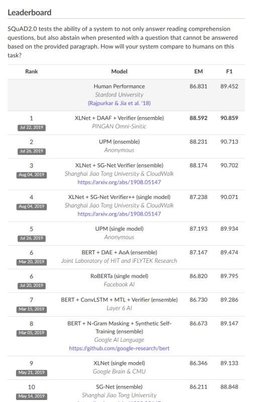 2018年,斯坦福大学著名的机器阅读理解赛事SQuAD,阿里巴巴曾凭借82.440的精准率打破了世界纪录,超越了人类82.304的平均得分。2018年11月,谷歌发布的BERT模型,在机器阅读理解顶级水平测试SQuAD1.1中,全部两个衡量指标上全面超越人类,并且还在11种不同NLP测试中创出最佳成绩。