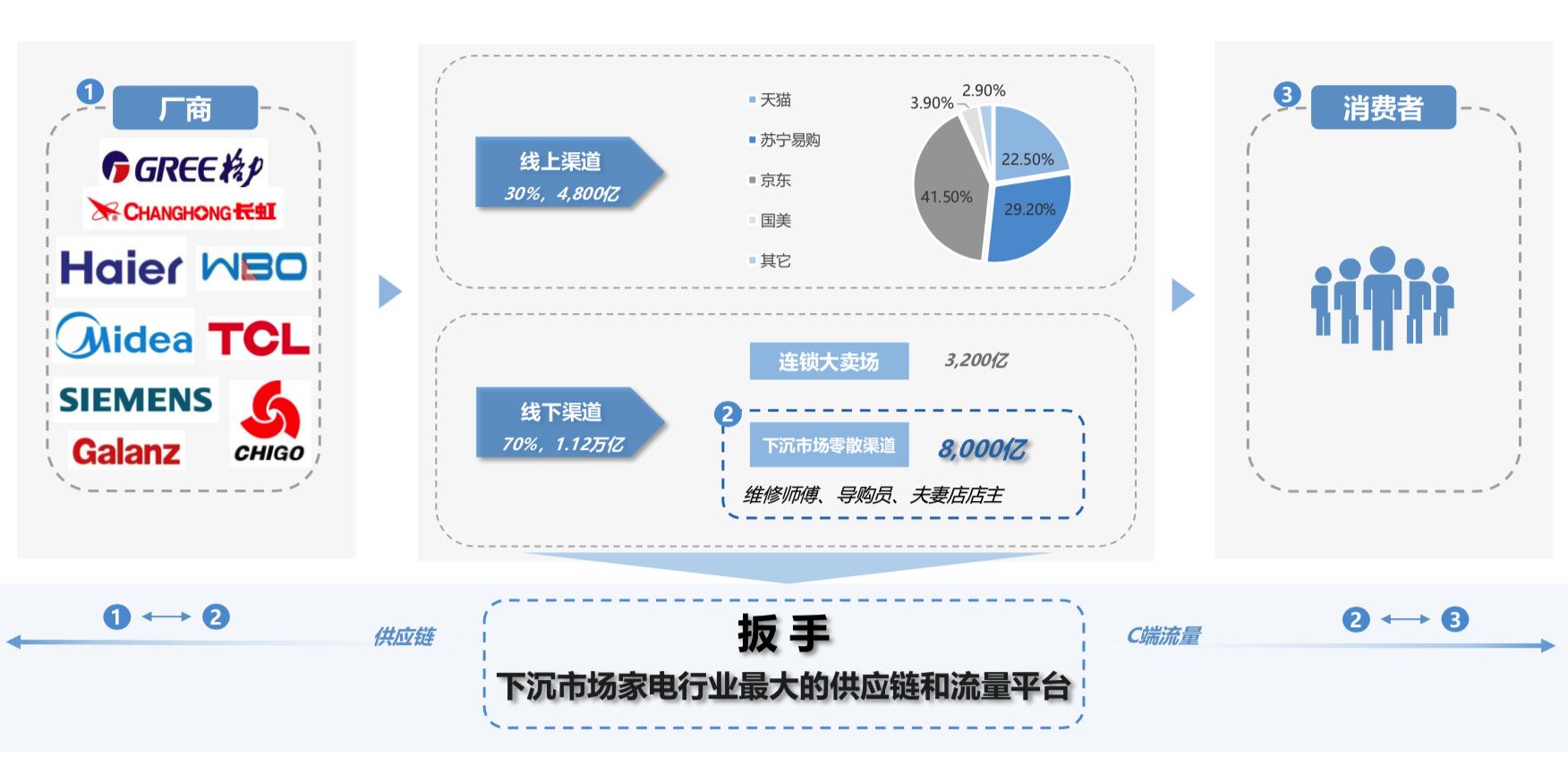 「扳手」即瞄准家电下沉市场线下销售渠道市场接受度高、连锁卖场未渗透到低端乡镇的市场空白,通过整合线下小型家电卖场、维修师傅、装配店等小B资源,打造下沉市场家电行业的供应链和流量平台。面向下沉市场家电销售链条冗长、效率低下的问题,「扳手」切入更贴近实际用户的中小B端,试图通过分销模式打通S2B2C的下沉市场家电销售通路。