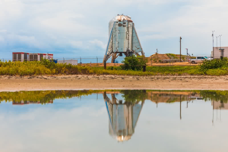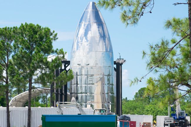 位于佛罗里达州的星舰飞船原型MK2,闪闪发光的不锈钢外壳反射着蓝天白云。