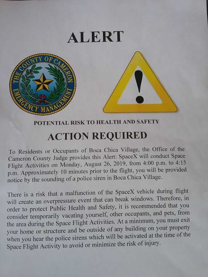 本次测试飞行前,Boca Chica附近的村民已接到通知,测试前10分钟会听到警笛声,要求在测试期间撤离居住场所,以免测试发生意外时对建筑物造成损害,例如冲击波可能会震坏玻璃。