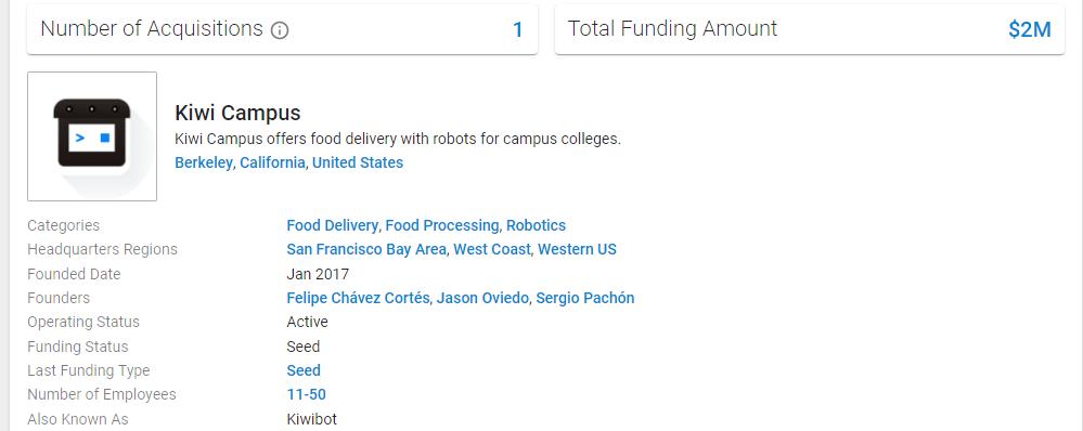Kiwibot 机器人于 2017 年 3 月开始在伯克利的校园内送餐,2018 年初扩展到斯坦福大学,之后又计划将业务扩展至帕洛阿尔托、圣何塞、洛杉矶等城市。
