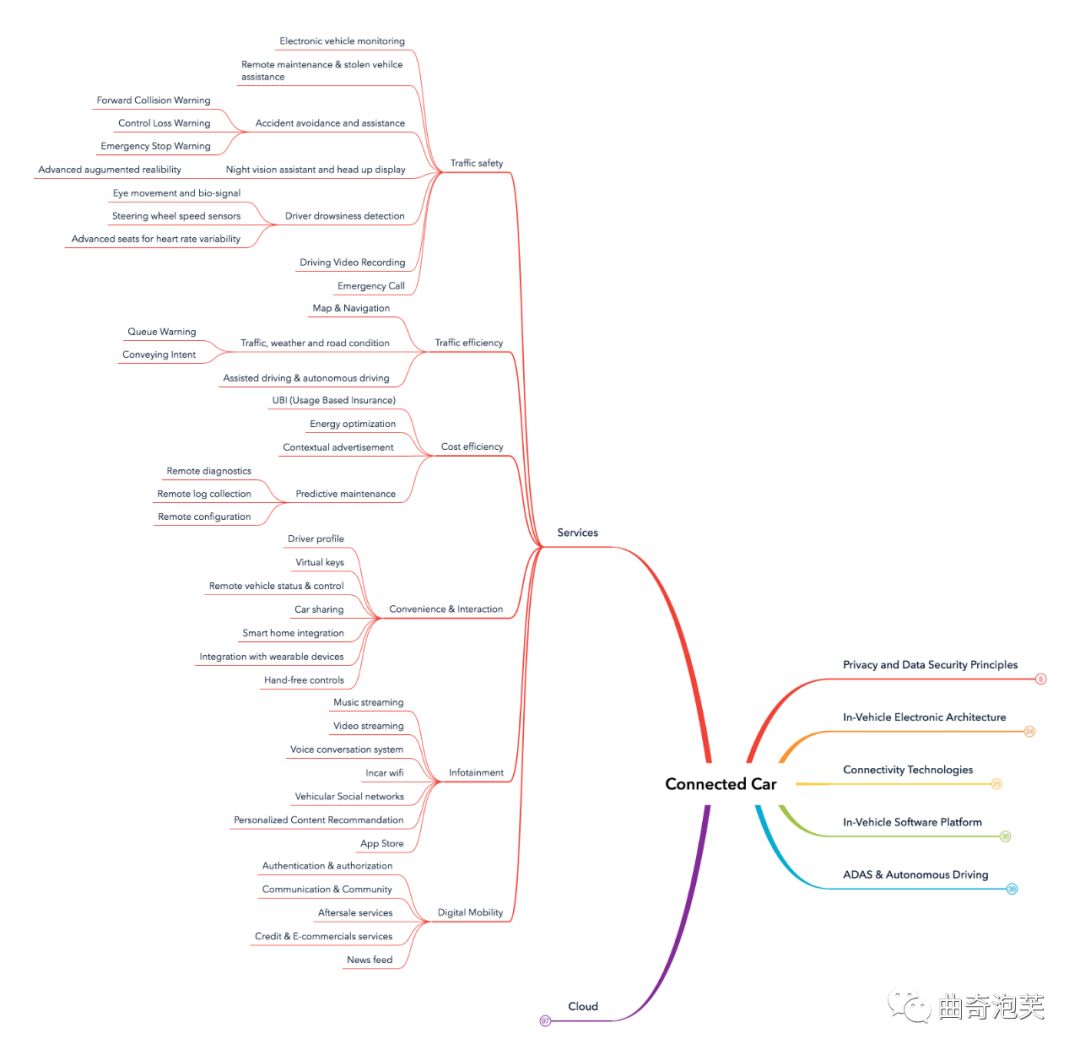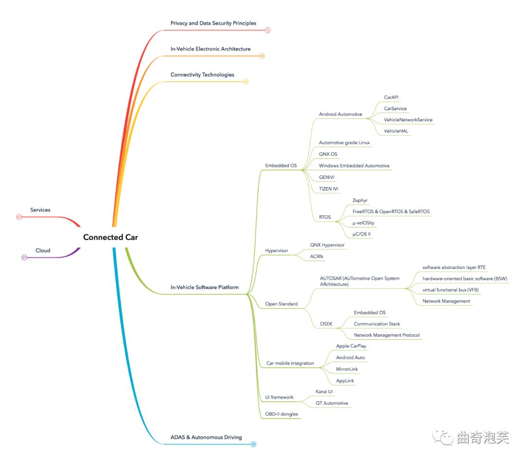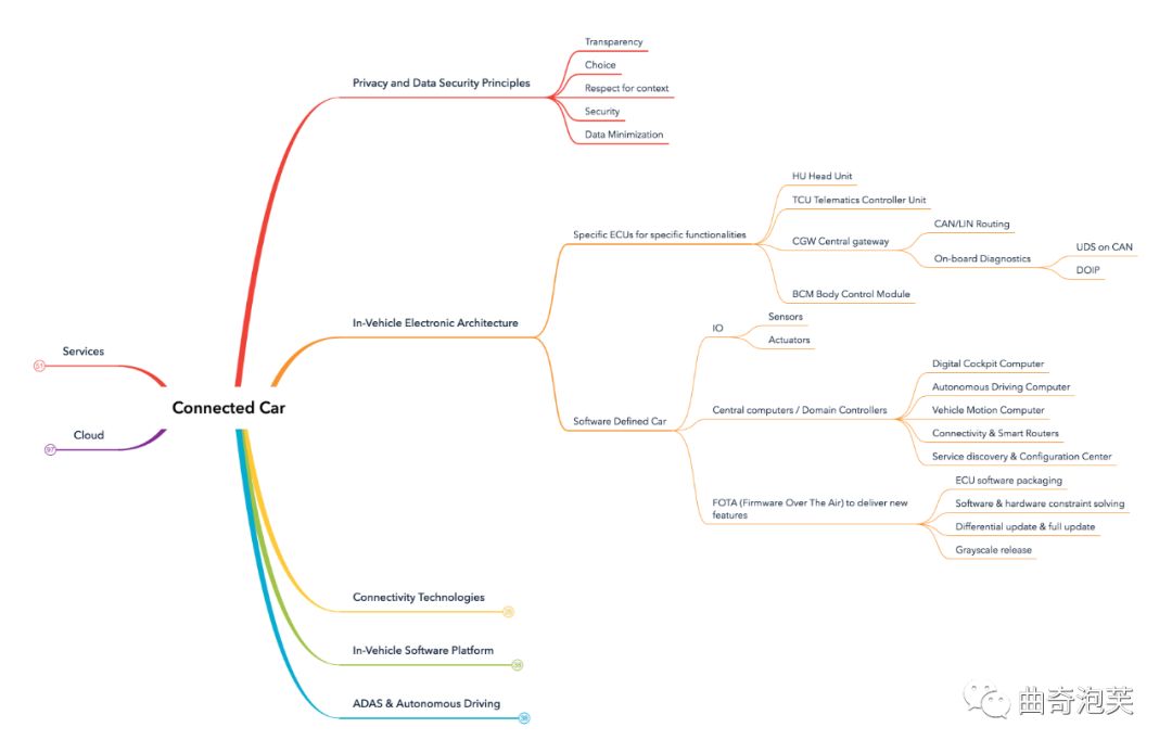 今天我们聊起车联网技术时,我们发现大家处于一个非常好的时机。过去互联网及移动互联网的快速发展,大规模软件系统技术具备了较高的成熟度,越来越多的在互联网行业被大量验证过的技术被引入到车联网中来,赋能智能汽车。笔者最近尝试在整理车联网端到端涉及的软件技术脑图,从服务、云端、整车电子架构、通信技术、整车软件平台和自动驾驶等方面去看,当我们聊起车联网技术时,可能会想到的东西。