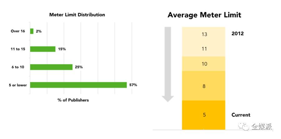 。就前者而言,大多数媒体的停止率都在变得越来越“吝啬”。 以《纽约时报》为例,在2011年首次设置付费墙时,读者每月可免费阅读20则新闻,如今下降为5篇。 从2012年至今,可免费阅读的文章数量从平均13篇降至5篇,目前超过一半的媒体都提供5篇及以下的免费阅读限额。