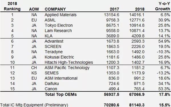 图:2018年全球半导体设备厂商营收排名,单位:百万美金(来源:VLSI Research)
