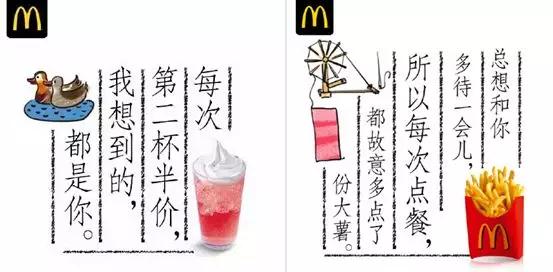 麦当劳曾经推出过一组“吃货”版三行情诗,就颇具日式三行情诗的风格。“每次第二杯半价,我想到的都是你”就在人们购买麦当劳时经常遇到的场景中植入情感触发点,而“每次点餐,都故意多点了份大薯”,具象化的细节让人好像看到坐在餐厅里欲说还休的小情侣模样。