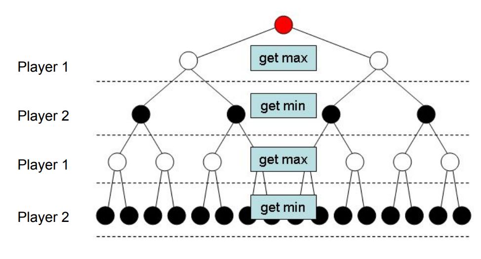 我们可以利用搜索树来理解这一过程,例如棋手每一步棋可以看作选择一个子节点,那么整盘棋一定可以表示为某条路径,现在 AI 要做的就是选择能带来胜利的路径。如下是最为经典的一种搜索树,AI 在每一个状态都希望最小化对手的最大收益。