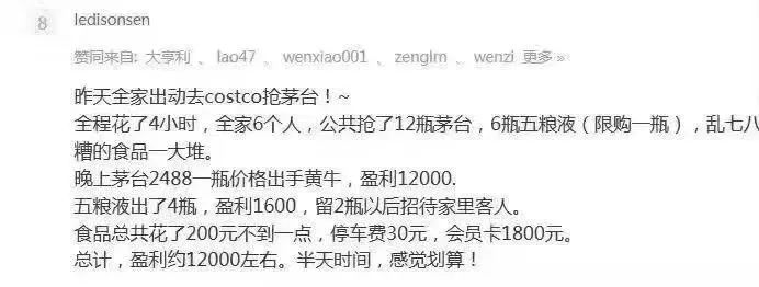 这是Costco,全球最大的连锁会员制仓储式超市落户上海的第一天,酱吧里有人圈出了“半小时抢空茅台酒”的新闻标题,还有一张真假莫辨的网友晒图:自己一家6口去抢购了12瓶茅台、6瓶五粮液,卖给黄牛后净赚1.2万。