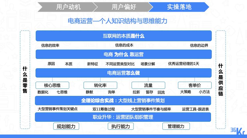 在前期对电商的新增量进行探索、分析之后,我们要对架构进行搭建以及进行实操落地,真正地把“内容”变为“行动”。这便需要电商运营者拥有以下知识结构与思维能力: