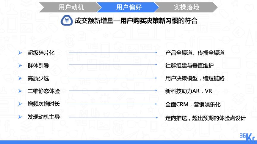 其中在用户的购买新习惯中,超级碎片化意味着电商从业者需要想清楚用户从哪里来,是否需要做产品的全渠道与传播的全渠道。群体引导和决策要求电商从业者了解各渠道用户习惯、各渠道产品特性、尽量打造极致的服务、将针对性区域的用户打透,同时做社群组建与垂直维护,以提升新量转化。