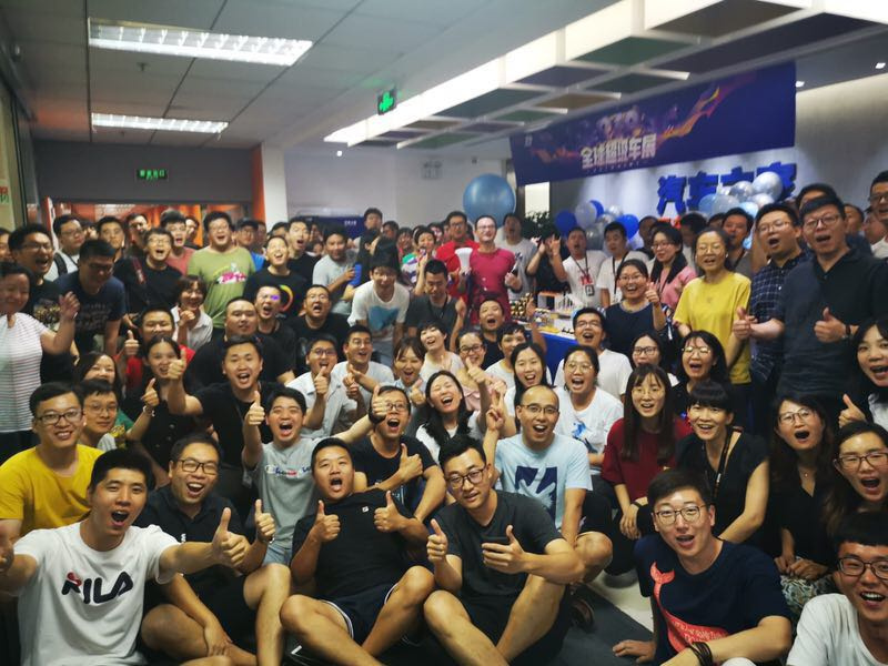 北京的技术保障团队也开始了狂欢。王晓、黄炜元、张京宇和大部队几十号人围在一起,竖起大拇哥,拍下了一张大合照。在他们背后,是被气球环绕起来的汽车之家蓝色logo。