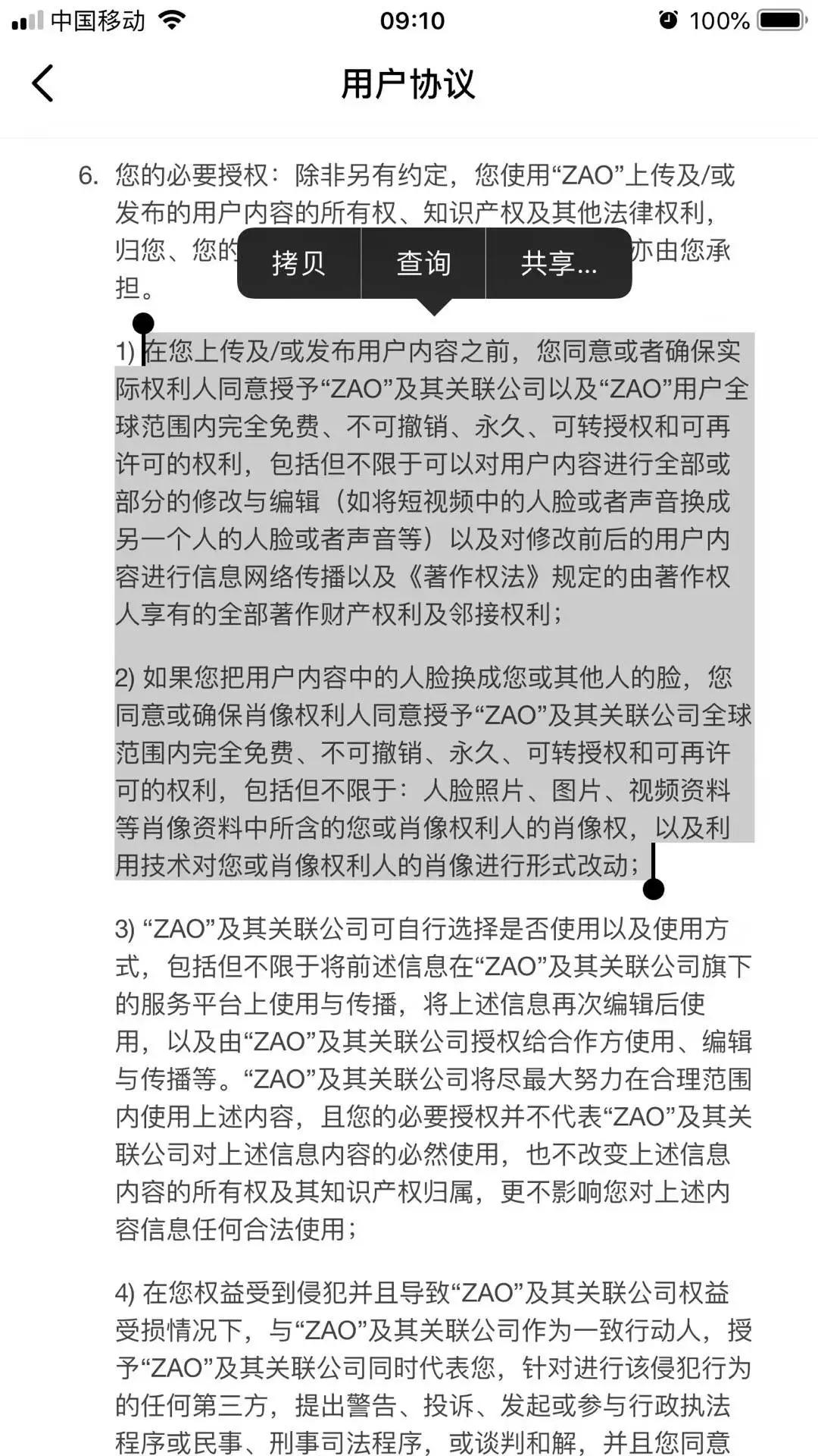 简单的说,你上传的肖像和生成的换脸小视频,已经默认授权给“ZAO”存储和管理了,它们会这么管理,如何管理,你的肖像会被用到哪里,你自己是不知道的。
