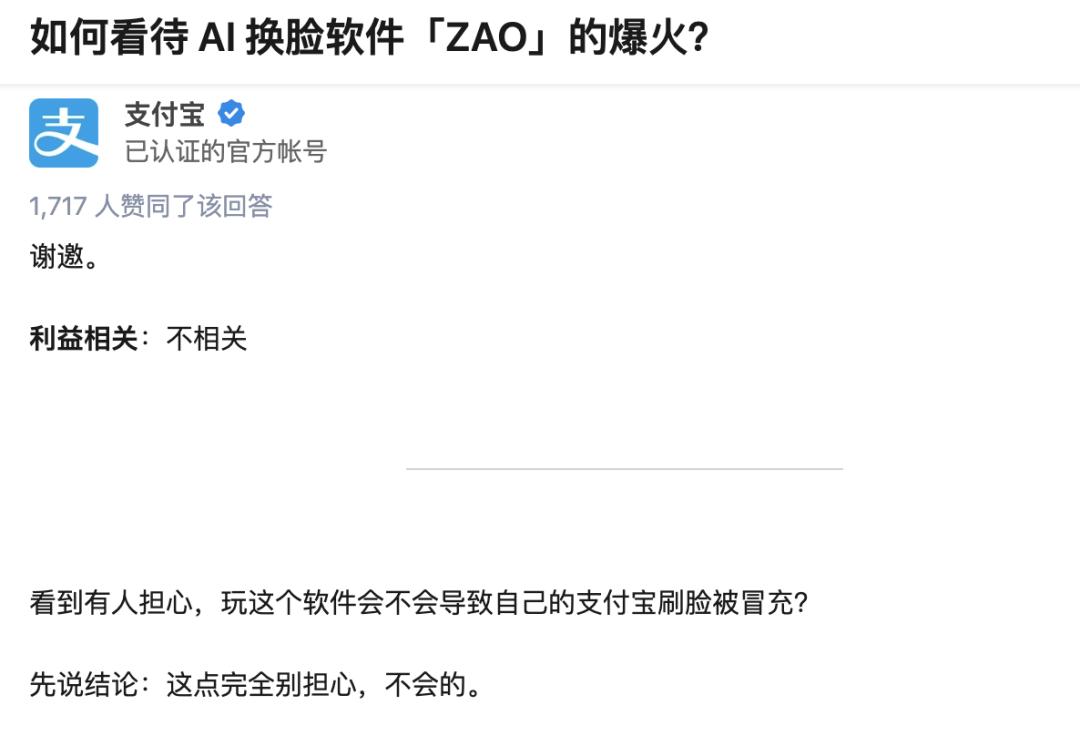 超会蹭热点的支付宝在知乎表示不用担心刷脸被冒充