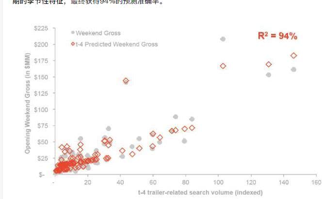 谷歌所采用的预测模型只选取了三种维度:电影预告片的搜索量、同系列电影前几部的票房表现、档期的季节性特征,最终获得94%的预测准确率。