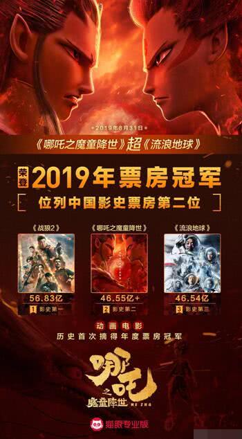 8月7日,猫眼预测,《哪吒》总票房会达到46.8亿,超过《流浪地球》。二十多天后的8月31日,猫眼数据显示,《哪吒》票房正式超过《流浪地球》,成为中国影史票房排名第二的电影。