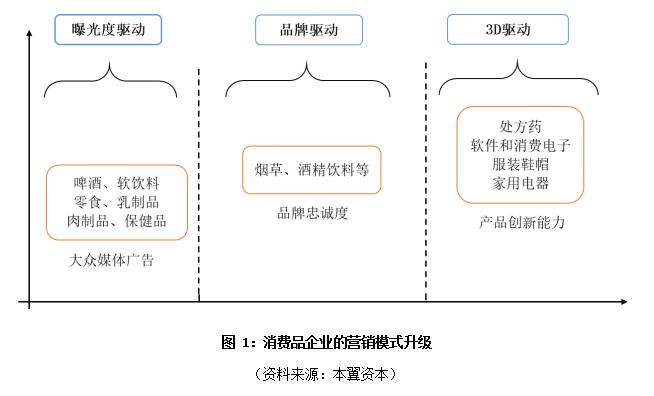 由于消品行业中的收入份额增长由销售费用份额和营销效率共同驱动,根据费用份额和收入份额之间的相关关系可以把消费品企业的营销模式分为三类:曝光度驱动、品牌驱动和3D驱动,三类营销对应消费企业发展的三个阶段:标准化、规模化和品牌化,其中标准化是企业创立的基础,规模化阶段采用的营销策略以曝光度驱动为主,品牌化阶段的营销策略则以品牌驱动3D驱动为主。消费品牌的营销模式通常从 “能见度驱动”向“品牌忠诚度驱动”进化再向“3D 驱动”进化。