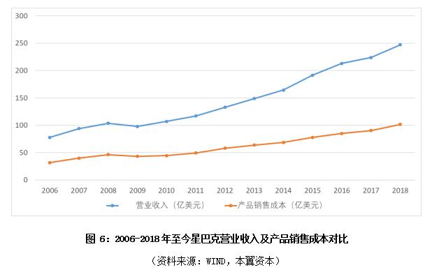 从经营数据表现来看,星巴克是在品牌化阶段充分发展成熟后达到了3D营销的阶段。从2006年至2018年,公司的营业收入始终高于产品销售成本且差额在不断增大,反映了品牌价值的不断提升。