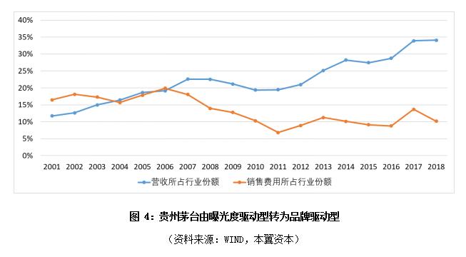 从营销模式来看,白酒行业是典型的品牌驱动型行业,这一特点在茅台的经营数据中也得到了清晰的反应。从茅台成立至2003年完成“万吨计划”,茅台前期的营销以曝光度驱动为主,销售费用占行业总销售费用的份额高于营业收入份额;经过2004年-2006年三年的品牌沉淀和营销转型,2006年以后茅台营业收入占行业总营收的份额始终高于销售费用份额,茅台正式进入“品牌化”阶段,收入增长不再依靠营销投入的增长,而进入了更加稳定和良性的品牌发展阶段,“茅台”这一品牌价值也在资本市场中不断推高,市值转折点与营销模式的切换点基本保持一致。