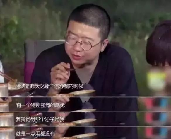 他跟汪涵说:“我昨天吃沙炒蟹的时候,有一个特别强烈的感觉,我觉得那个沙子是我,一点用都没有。”