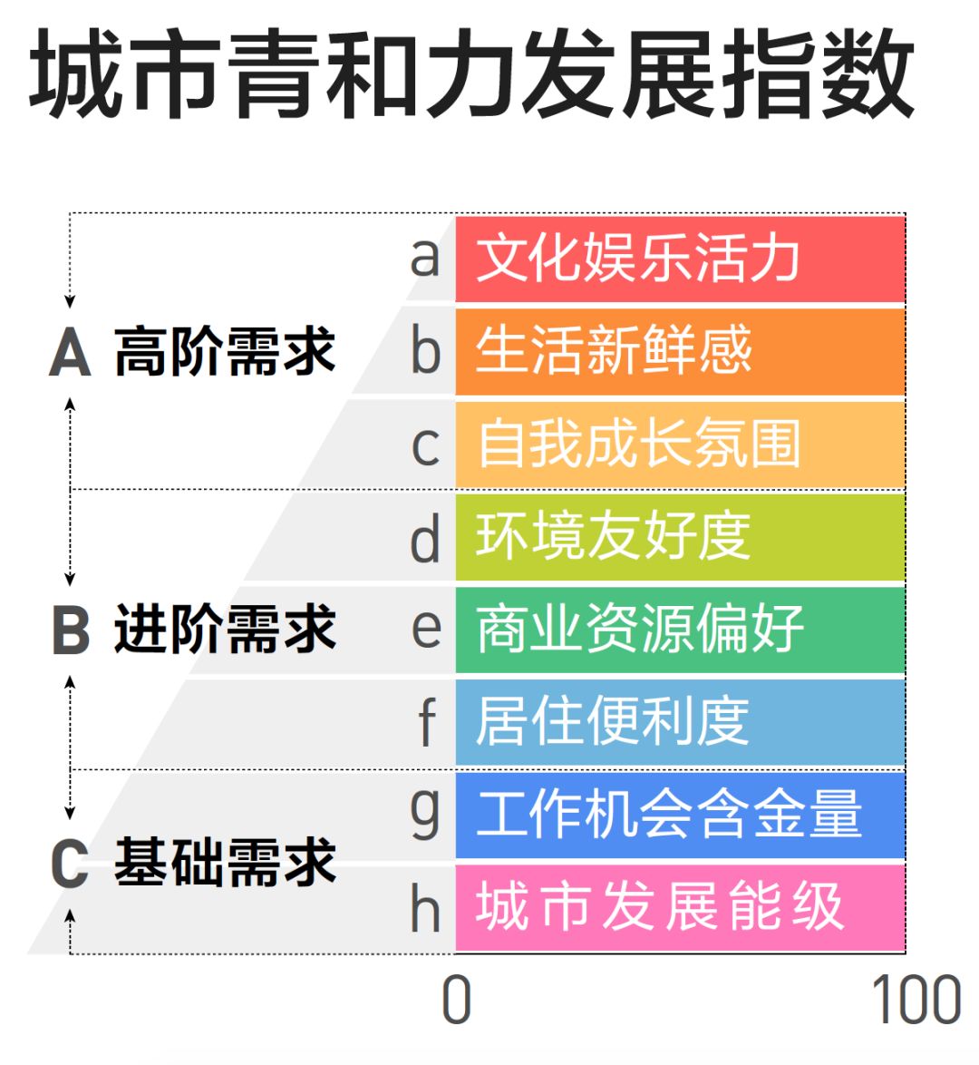 为了回答这个疑问,DT财经( ID: DTcaijing )在上海发布了《2019中国青年理想城报告》( 下称<报告> ),用“青和力”来指代一座城市吸引年轻人的能力,借助来自于25家互联网公司和数据机构的大数据,通过 8个一级指标、25个二级指标、70个三级指标 ,对城市青和力进行量化评估。