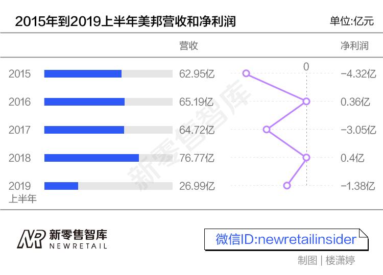 数据显示,2015年到2019上半年美邦的营收分别为:62.95亿、65.19亿、64.72亿、76.77亿、26.99亿,净利润分别是:-4.32亿、0.36亿、-3.05亿、0.4亿、-1.38亿。