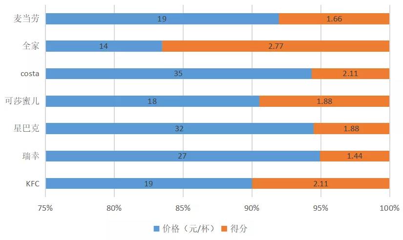 七位参赛选手,星巴克、COSTA和瑞幸是专业玩家,其他四位都是跨赛道的业余玩家。KFC和麦当劳比较常见,湃客咖啡应该是便利店咖啡的代表,可莎蜜儿是杭州当地一家烘焙企业。