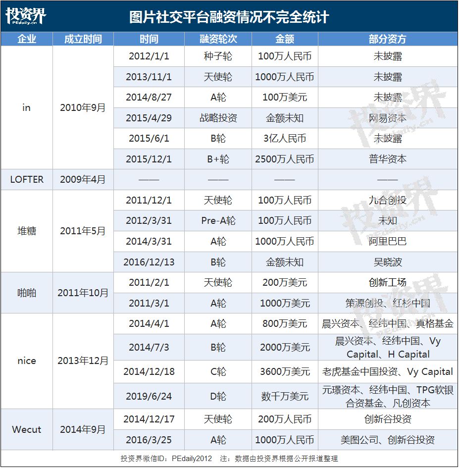 投资界(ID:pedaily2012)梳理发现,目前活跃度较高的图片社交App成立时间全部在2015年之前,一度受到不少VC的青睐,其中不乏经纬中国、真格基金、海纳亚洲这样的明星机构。