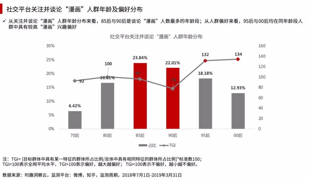 通过时趣洞察云的相关大数据分析能够发现,在微博知乎等社交平台上,尽管条漫/漫画主要阅读人群为85后、90后,但95后、00后对条漫/漫画内容更加偏爱,TGI值更高。