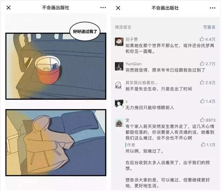 今年的“黑马”条漫公众号要数「不会画出版社」,在公众号数据普遍走低的情况下,「不会画出版社」第五篇文章《“别难过,我先走啦。”》就已经获得百万阅读,如今每篇推文已经稳定在10w+。