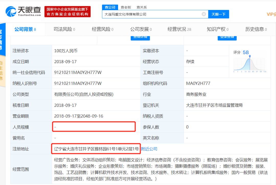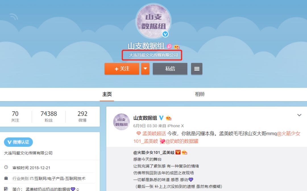 因为孟美岐的粉丝数据组之一“山支数据组”,其企业认证信息正是大连玛爱文化传媒有限公司。