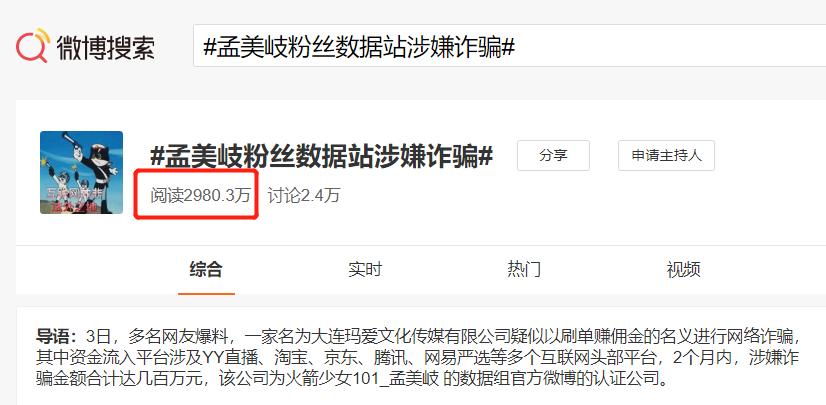 截止到目前,关于孟美岐粉丝数据组涉嫌诈骗的话题,在微博热搜毫无动静,但实际相关话题阅读量早已经破了几千万,许多博主的消息点赞转发上万。