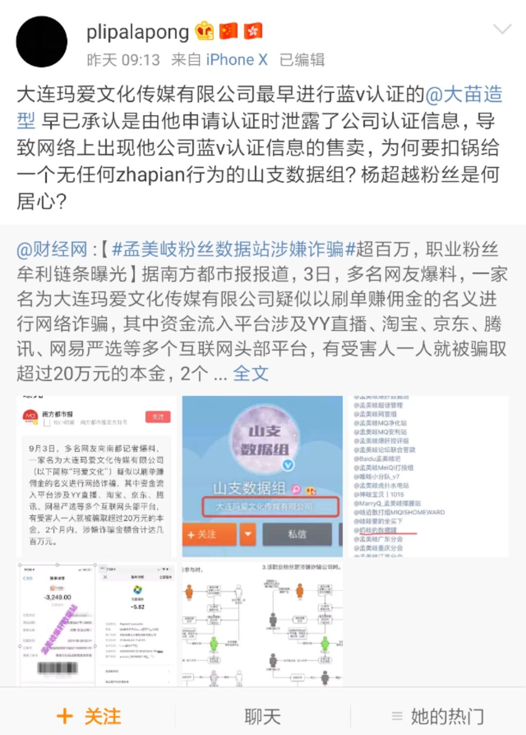 玛爱文化诈骗案曝光以后,有不少孟美岐的粉丝开始出来洗地称,山支数据组的蓝V认证信息是买来的,对玛爱文化诈骗事件并不了解。