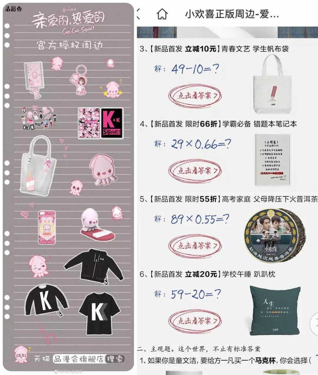 当然,热门都市剧、民国剧也同样会打造衍生产品。家庭教育剧《小欢喜》围绕剧中的高考元素打造了错题笔记本、父母降压茶等商品。《亲爱的,热爱的》先后有三家开发商入局打造衍生品,其产品多以鱿鱼元素为主。《烈火军校》则结合了中华人民共和国成立70周年的政治热点,打造了又红又正的衍生品系列。
