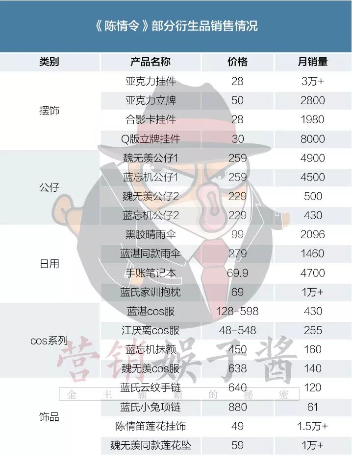魏无羡、蓝忘机单价28元的Q版亚克力挂件在上线20天内售出3万件,49/59元的魏无羡陈情笛挂饰、同款莲花坠已共有2.6万人付款,剧情元素的雨伞、Q版毛绒玩具也都取得了不错的销售量。