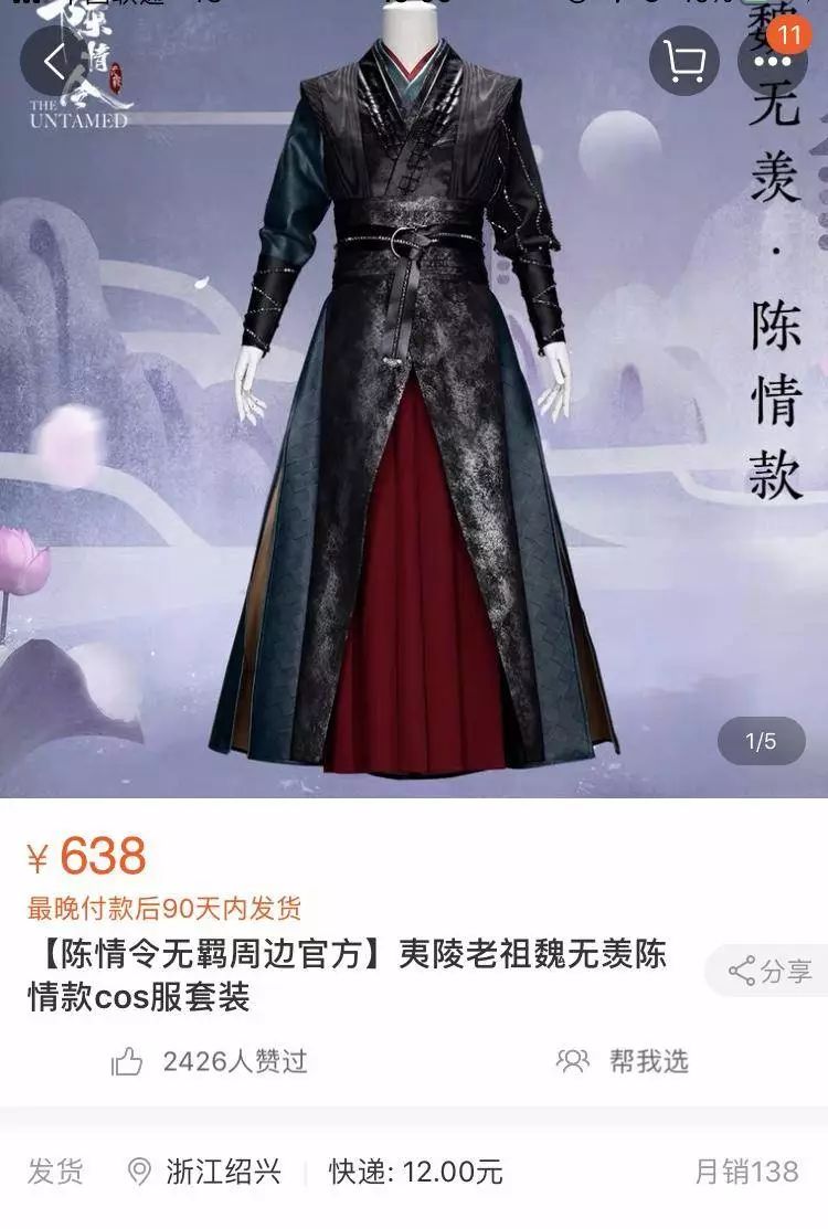 而同时具备耽美、古装元素的《陈情令》在衍生品开发方向则更具备优势。因原著《魔道祖师》为ACGN届顶流IP,搭配着剧集和演员的热度,《陈情令》出品方新湃传媒开发了部分人物的cos服及角色饰品,以供从二次元游来或想趁机入二次元坑的粉丝收藏或穿戴。
