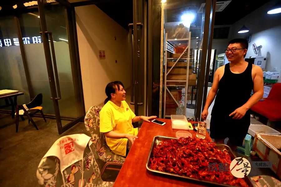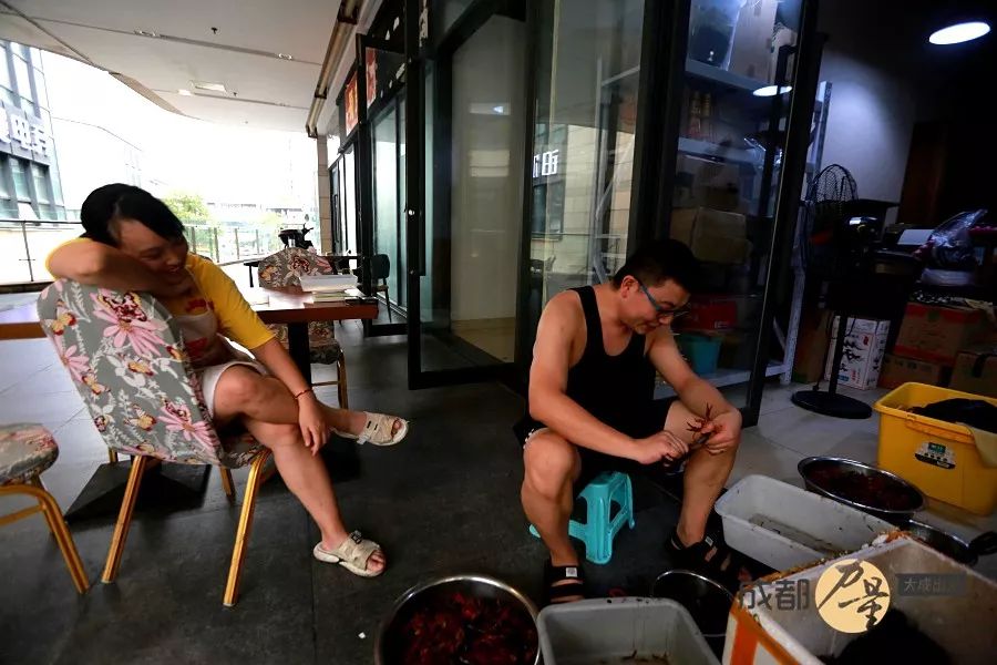 小龙虾过油,装盘,放凉,做完准备工作,陈爽歇了下来,和艳均聊天,等待生意上门。
