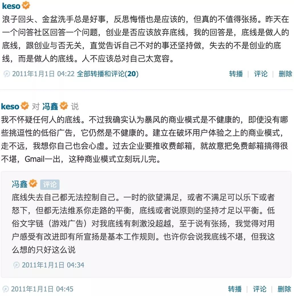 我和冯鑫也有过一面之缘。2011年元旦,冯鑫在腾讯微博上宣布,暴风影音清理了低俗小广告,放弃了几百万唾手可得的收入,终于“不低俗”了。我对此揶揄了几句底线问题,后来冯鑫邀请我去他公司聊天。