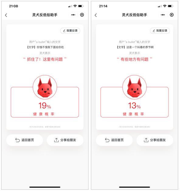 文字信息对机器来说还相对容易,图片和视频在技术上会有更大难度。目前,“灵犬”小程序还不支持检测视频。