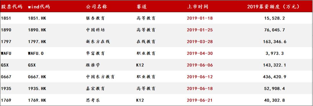 截至2019.9.6日,2019年国内教育行业IPO共8起,合计融资金额达到约93亿元人民币。赛道分别为高等教育、在线教育、K12及职业教育。
