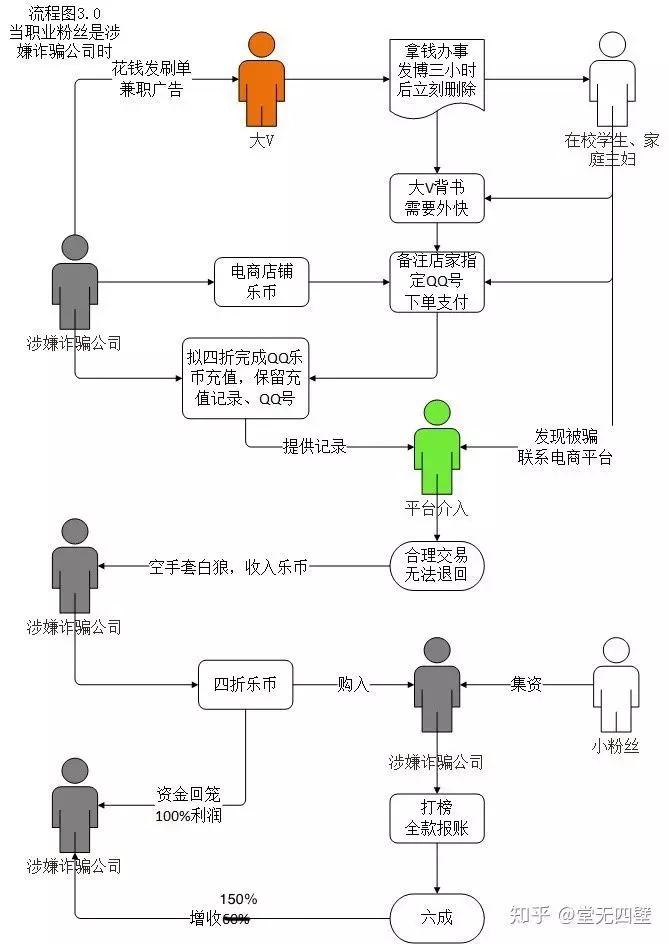 至此,“山支数据组”的“脂粉”的身份彻底被揭开,而在这一环节中,涉及的还有其他有影响力的大V粉头。这些粉头利用自己的影响力为“诈骗公司”做广告宣传,使得粉丝上当受骗。知乎上有人整理了如下流程图: