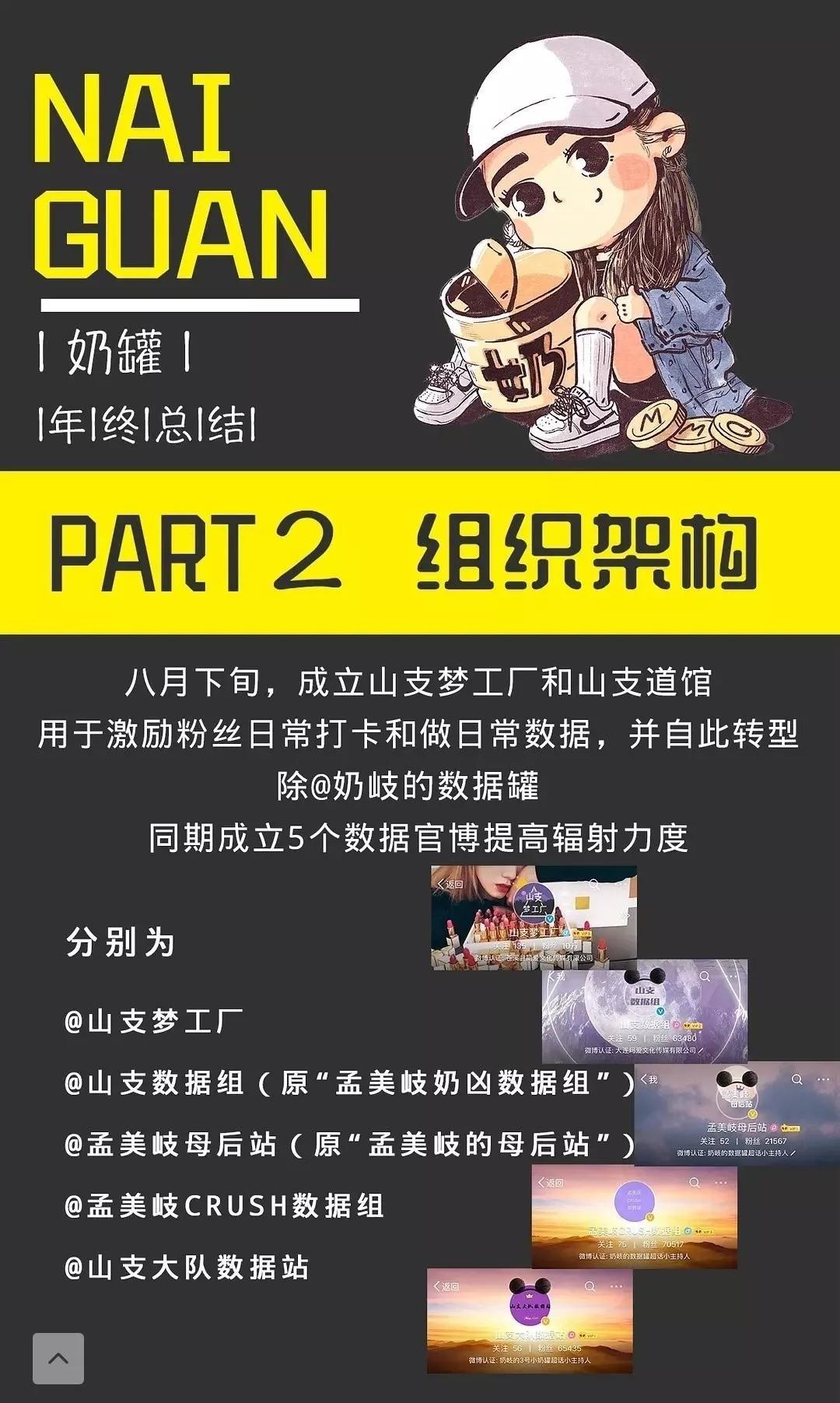 据了解,“山支数据组”的前身是“孟美岐粉奶凶数据组”,成立于2018年《创造101》播出期间,为“奶岐的数据罐”成立的下属数据官博,并举办超过200次的集资活动。进一步深挖,“奶罐数据站”则与“孟美岐爆肝数据站”为联合组织关系。
