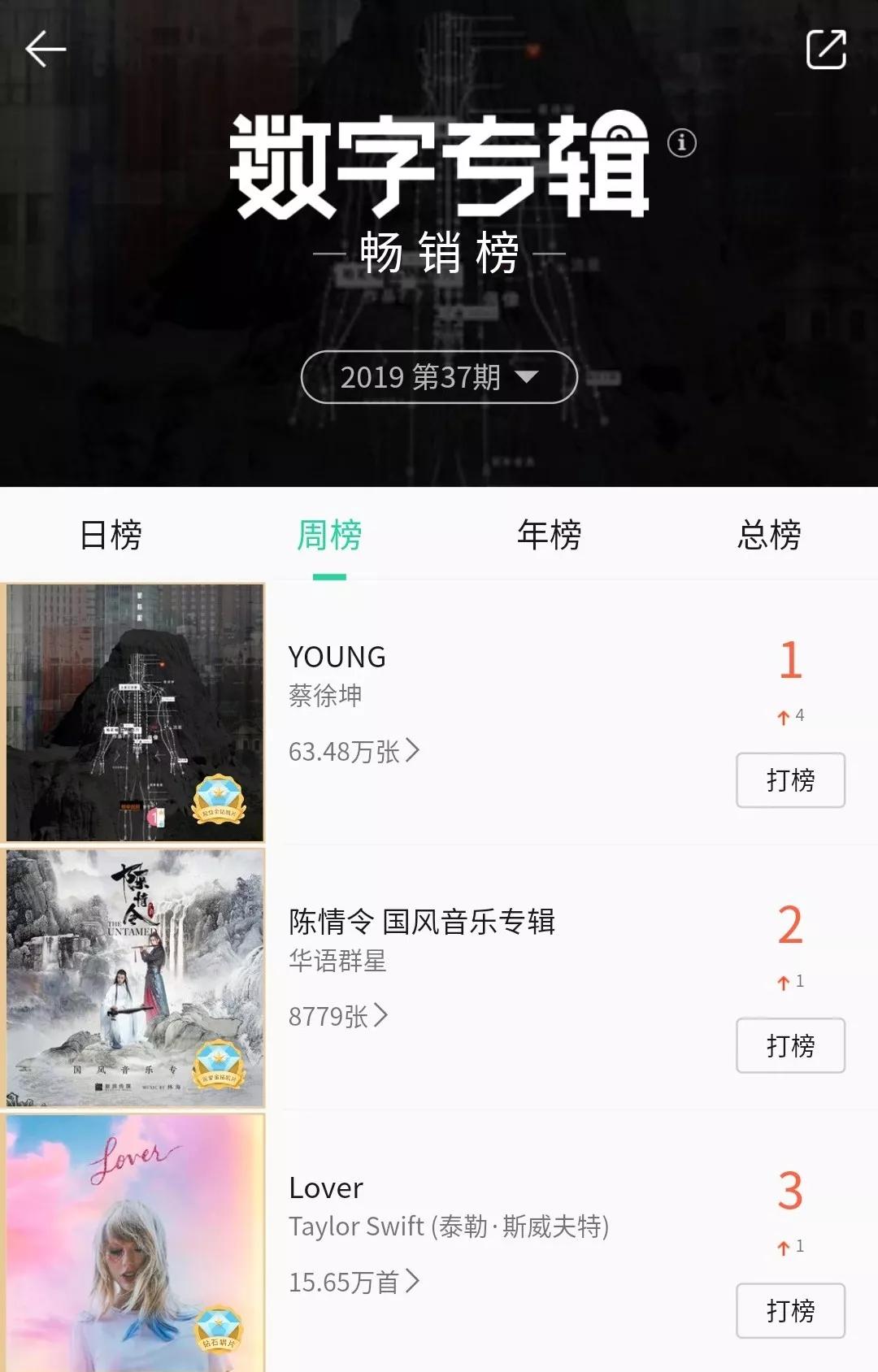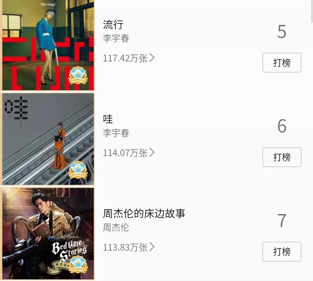 “专辑畅销榜”又分为日榜、周榜、年榜和总榜。数字专辑达到不同的销量量级,还会有不同的认证级别。比如,销量达到100万张,该专辑就会获得“殿堂金钻唱片”的认证标志。