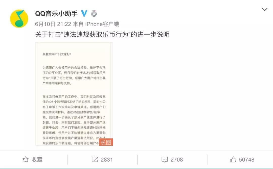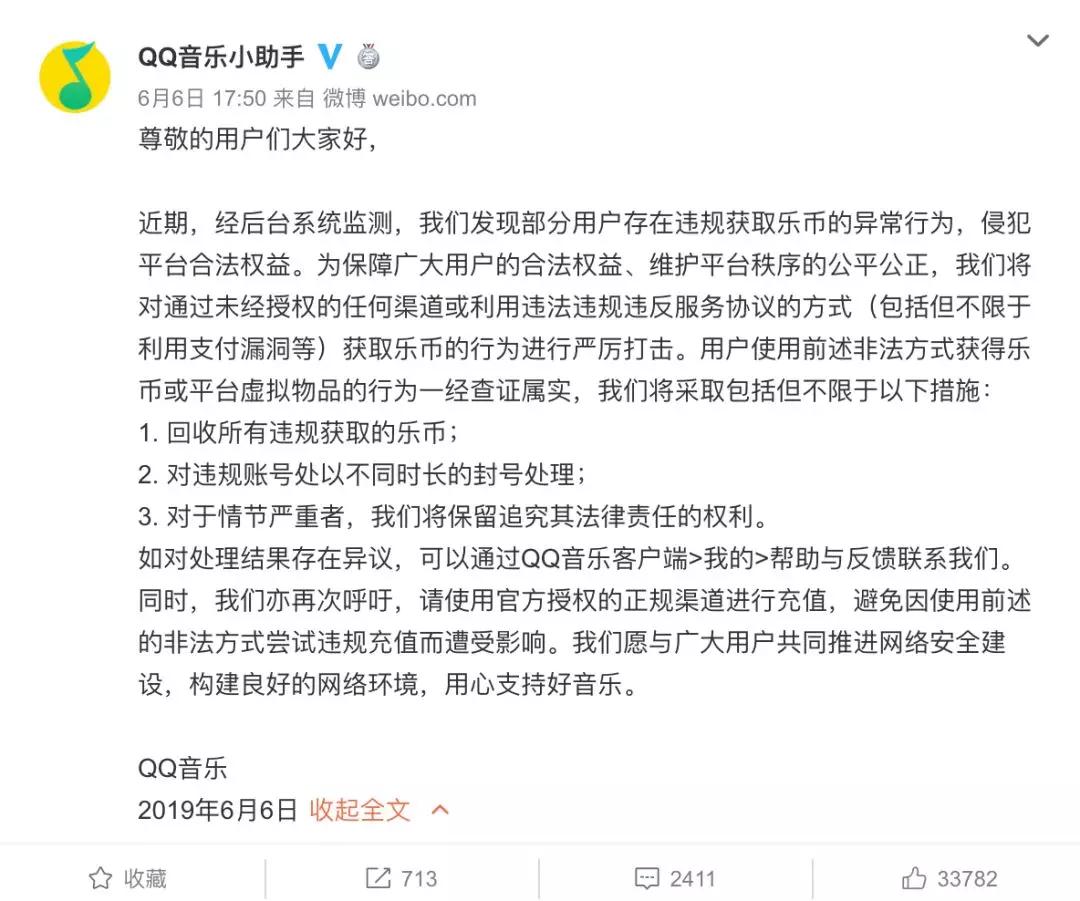 2019年6月6日,微博账号@QQ音乐小助手 公开发文称:经后台系统监测,发现部分用户存在违规获取乐币的行为,侵犯平台合法权益。