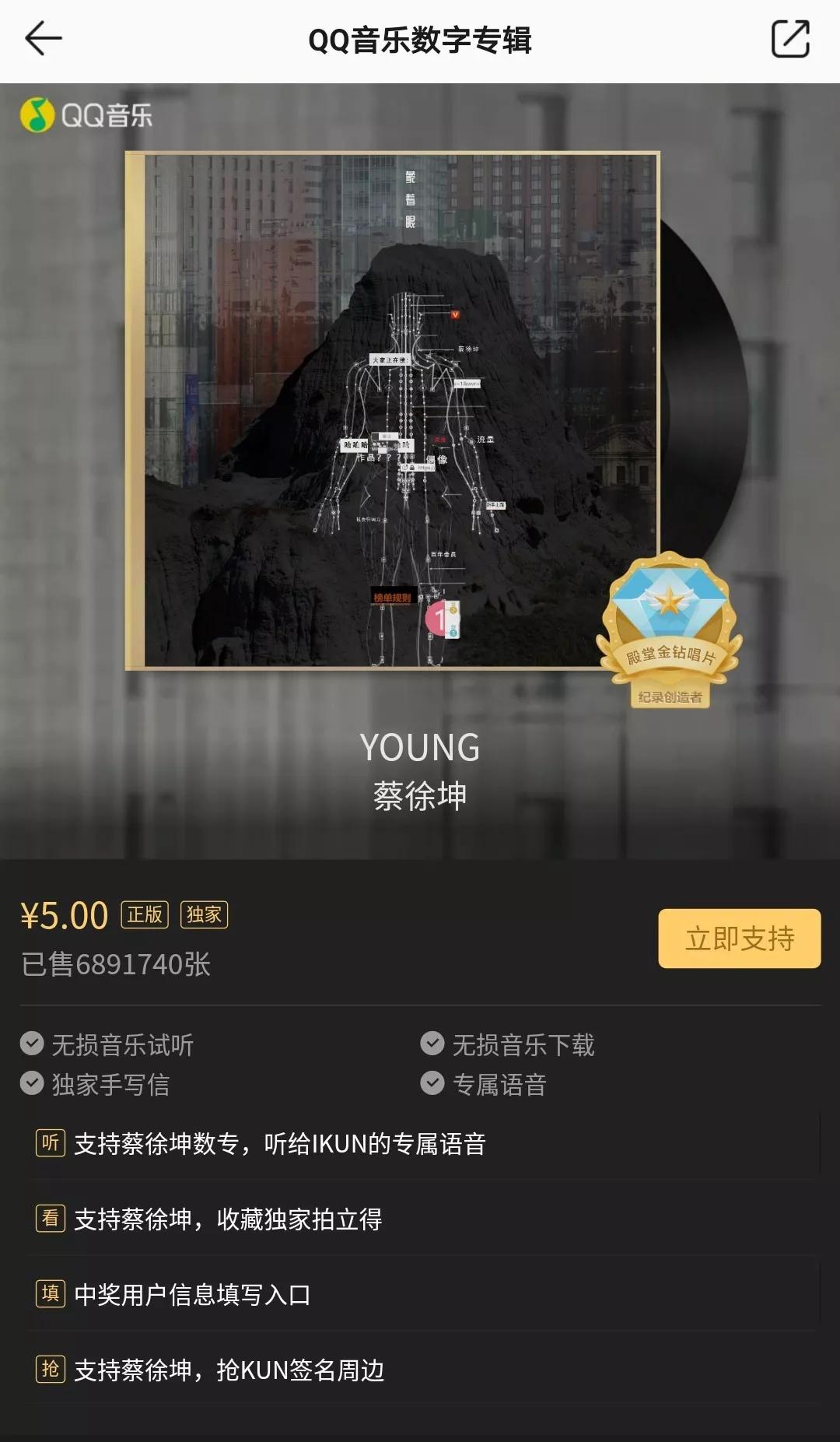截止9月7日下午7点,QQ音乐“专辑畅销榜”总榜第一名为蔡徐坤的新专辑《YOUNG》,销量高达690万张。按照每张售价5元计算,QQ音乐仅凭这一张专辑就进账3450万元。如此算下来,总榜前4的销售额已经过亿。