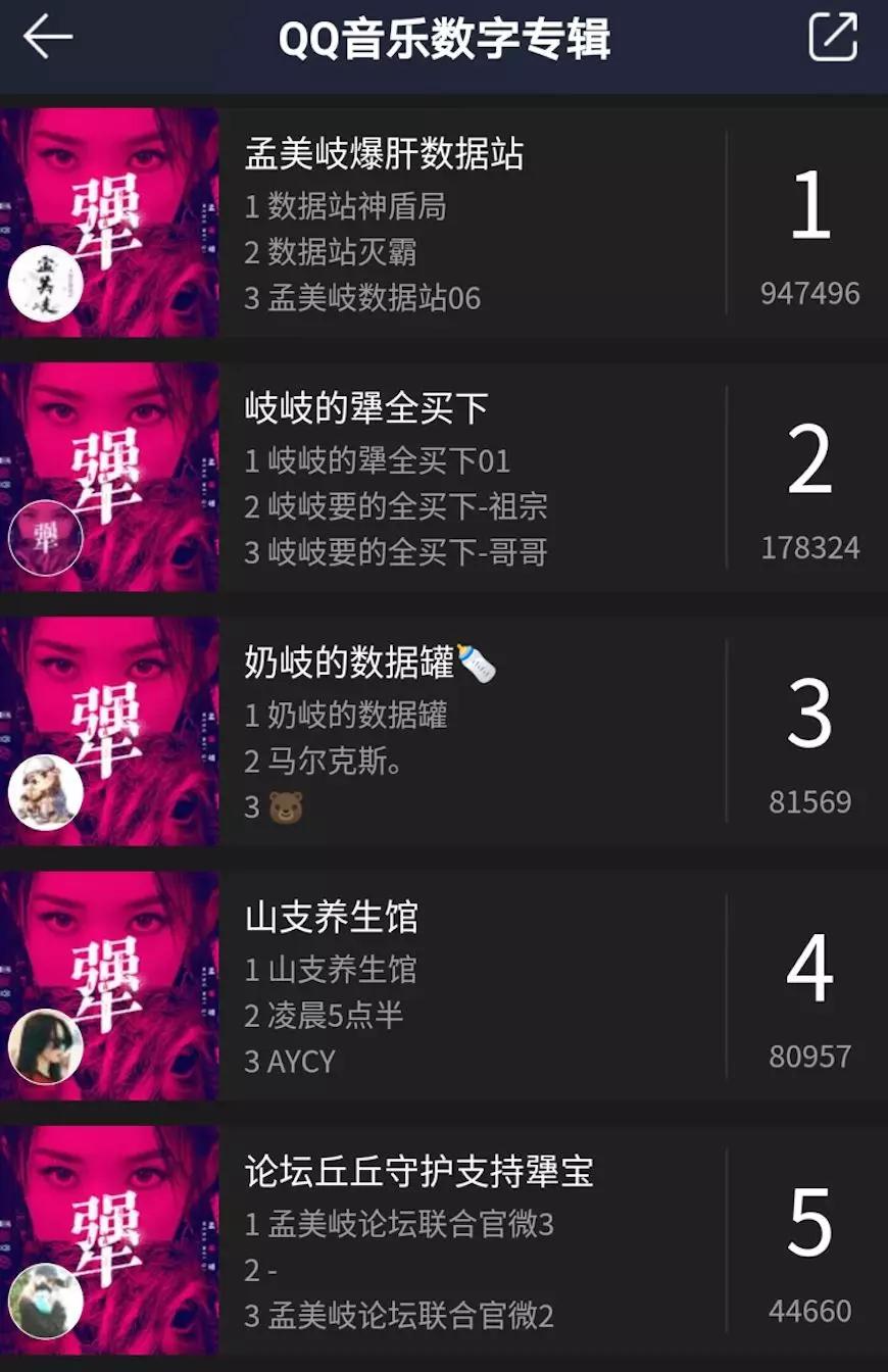 从QQ音乐《犟》的数字专辑售卖页面可以看到,“孟美岐爆肝数据站”位列购买排行榜第一名,一共购买了94万7千余张专辑。而“奶岐的数据罐”位列第三名,共购买了8万余张专辑。