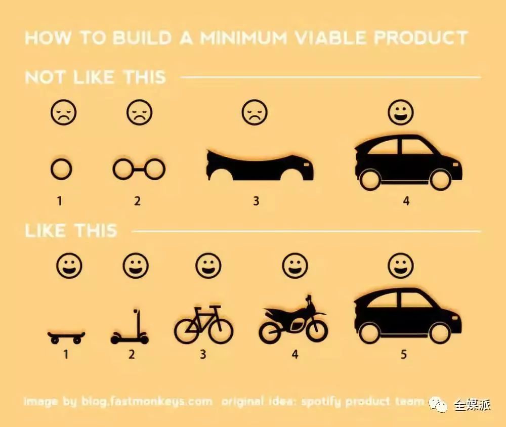 MVP示意图:造汽车前,用滑板车等工具示意其可行性,而造轮子并不能让用户理解