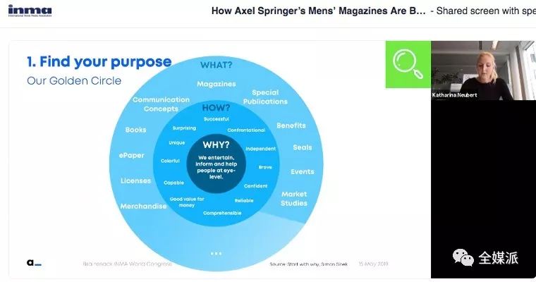 一个公司如何找到并且实现这种理念?Neubert引用了“黄金思维圈法则”(“Golden Circle”,又称GC法则)。这个“黄金圈”有三层: