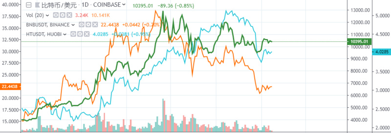 图中绿色线为BTC价格走势,橘色线为BNB价格走势,蓝色线为HT价格走势。本周BTC价格受降准消息影响较大,从9600美元迅速拉升至10900美元,而后回落至目前的10300美元。